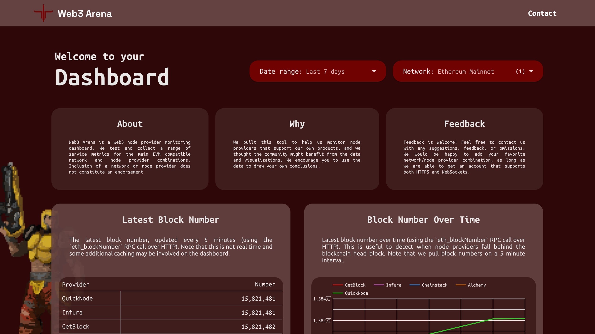 Curvegrid has launched Web3 Arena, a public portal that displays near real time data and statistics for various node providers across multiple blockchain networks. It compiles the data into visualizations, which update every 5 minutes. The graphs can be used to assess the performance and reliability of different node providers, with up to 30 days of historical data available for comparison. Users can see the node provider's performance across four categories: Latest Block Number, Block Number Over time, HTTP Errors and Websocket Disconnections.