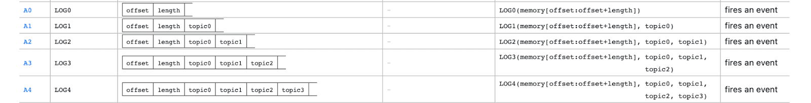 The LOG0 to LOG4 opcodes create log records. [reference]