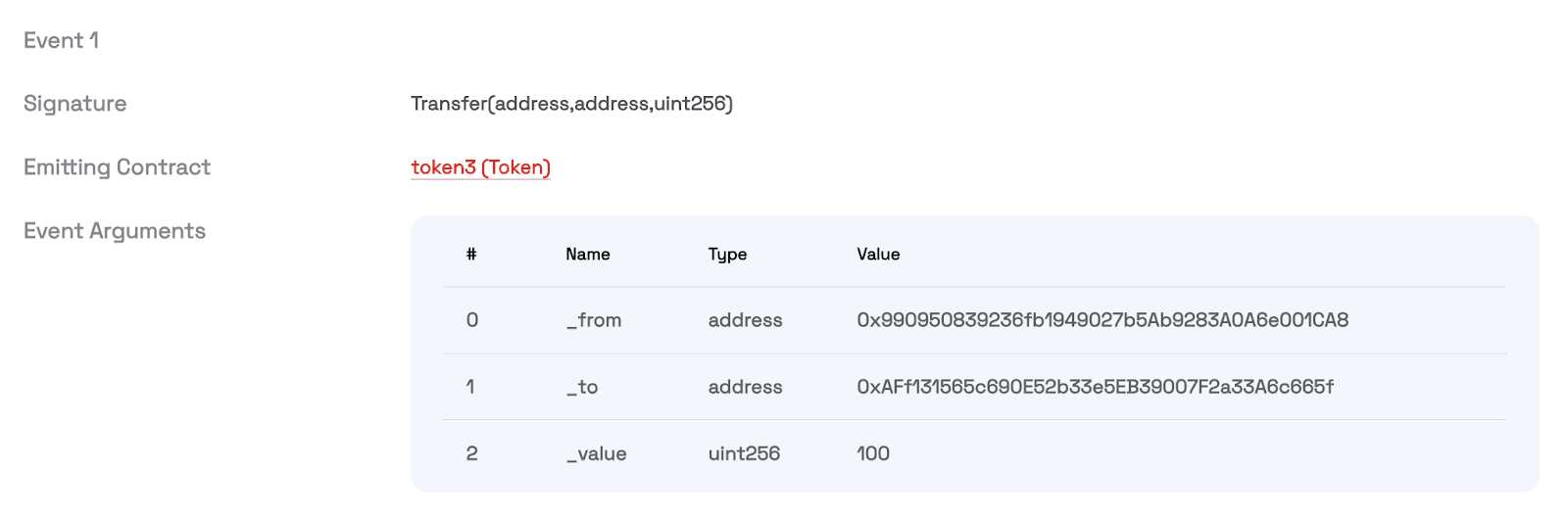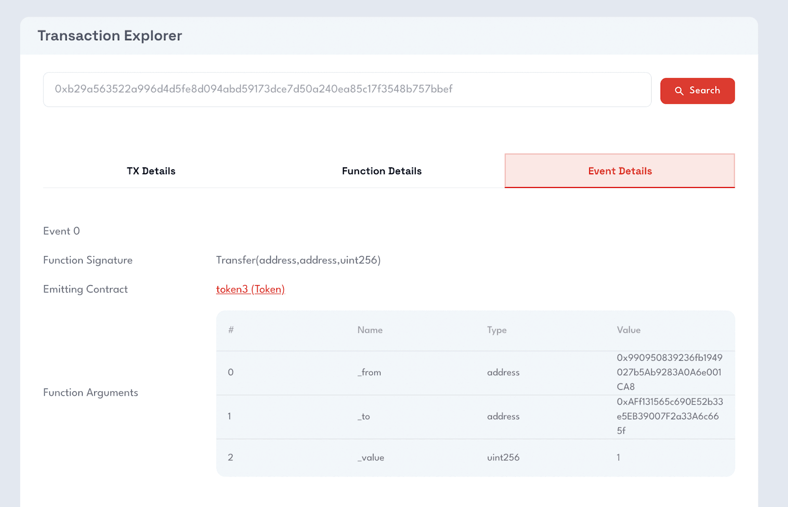 This is how Transaction Explorer looks like on MultiBaas, we can see all the event details including original function signature, decoded event parameters, link to emitting contract, and function arguments.