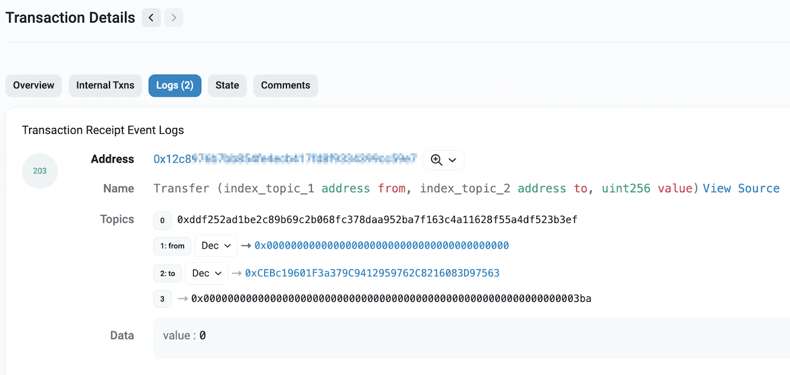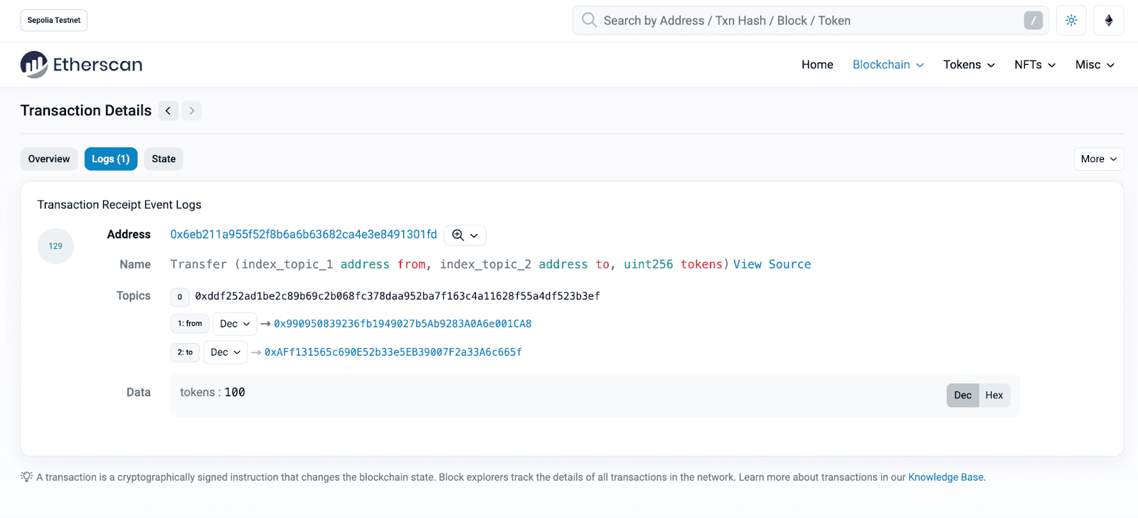 We can see the same transaction hash on Etherscan as well. Here we can see the logs: