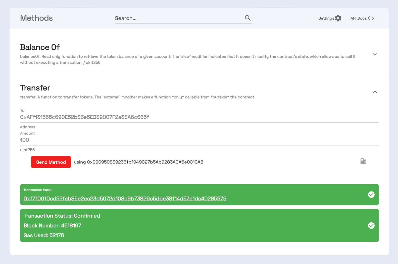 Let’s trigger an event by calling a contract function that emits an event. At your contract page, if you scroll down you can see the Events section and that it’s empty right now. Now, let’s trigger the event. At the Methods section, trigger our Transfer event by transferring some PANDA tokens. Add a new wallet address to which you’d like to send tokens and the amount of tokens you want to send. Finally, click on Send Method and confirm the transaction. MultiBaas will listen for the event and catch it.