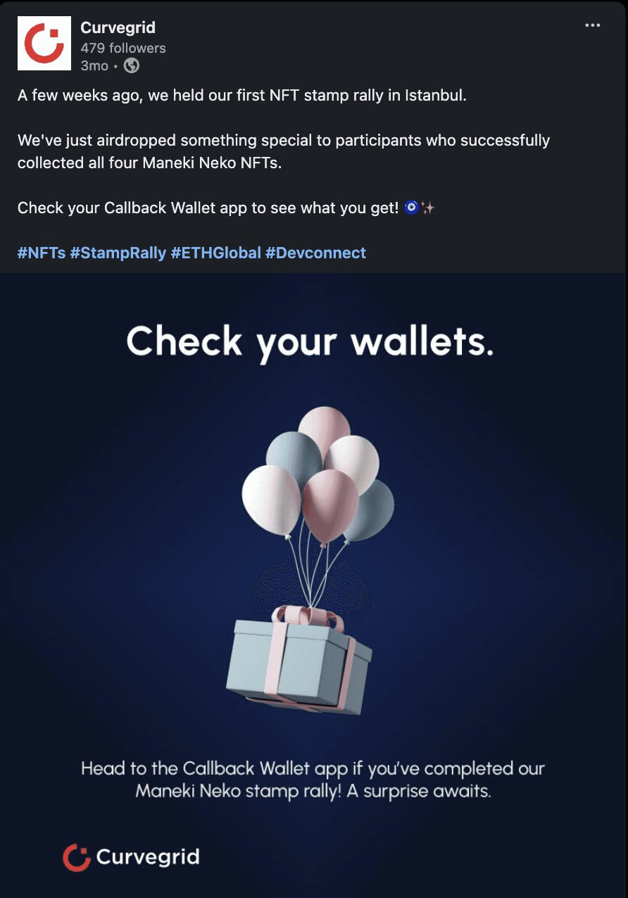This collaboration was successfully realized during ETHGlobal Istanbul, where Curvegrid distributed commemorative NFTs to event participants at an NFT stamp rally using the Callback Wallet app.