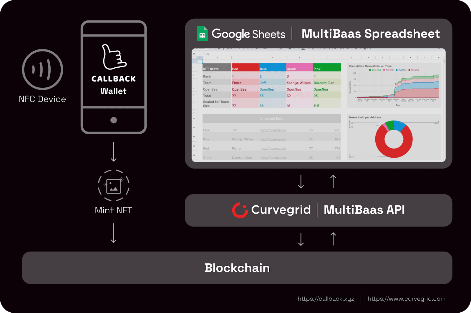 On the backend, Callback utilized MultiBaas Spreadsheet to monitor in-app minting transactions which allowed them to airdrop rewards to top collectors that minted all four unique tokens.