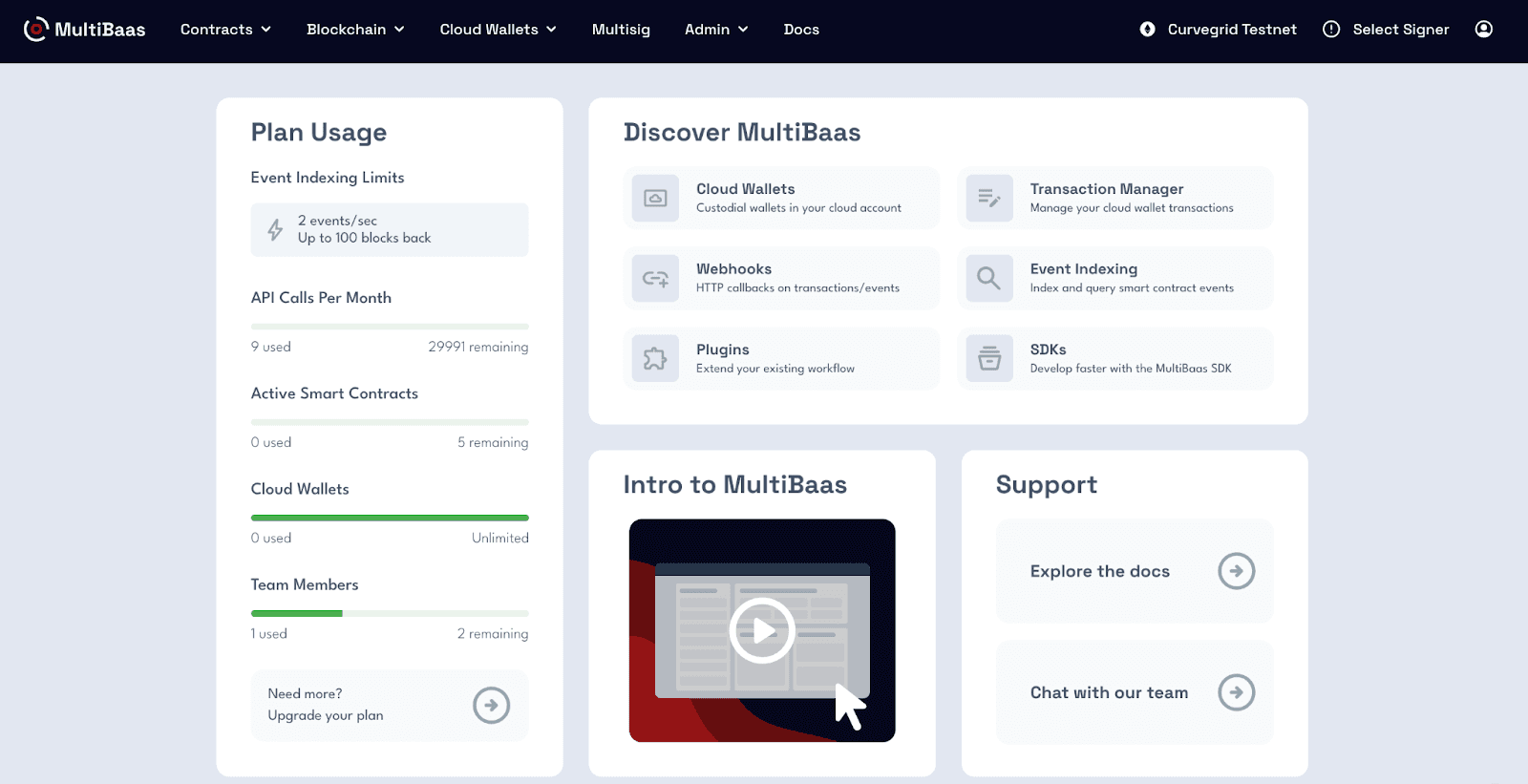 Curvegrid’s team of Web3 blockchain engineers are available to lend support and help users get onboarded to MultiBaas. Custom smart contract deployments and flexible plans are also included as part of Curvegrid’s enhanced service offerings.