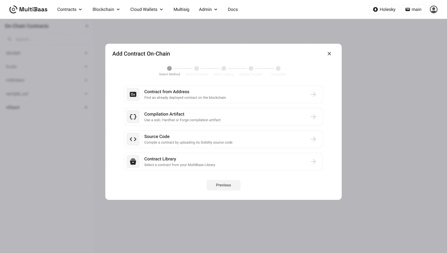 Add contracts by address: Input a smart contract’s address to directly add it to the MultiBaas contract library. This allows you to follow events and interact with the on-chain contract or deploy your own copy.
