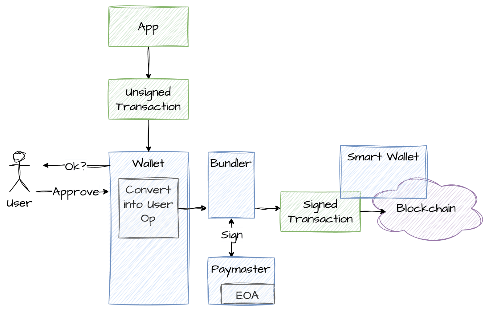 The title of the ERC-4337 standard itself is Account Abstraction Using Alt Mempool. The "alternative mempool" refers to the fact that transactions using ERC-4337 are processed by an off-chain service called a Bundler, that gathers User Operations into an on-chain transaction, and submits them to a canonical Entry Point smart contract for execution. The scheme relies on standard interfaces between the various components, including an on-chain smart wallet that takes the place of the off-chain EOA. The benefits include alternative gas payment schemes and transaction batching, but at the expense of having to deploy a per-wallet smart contract.
