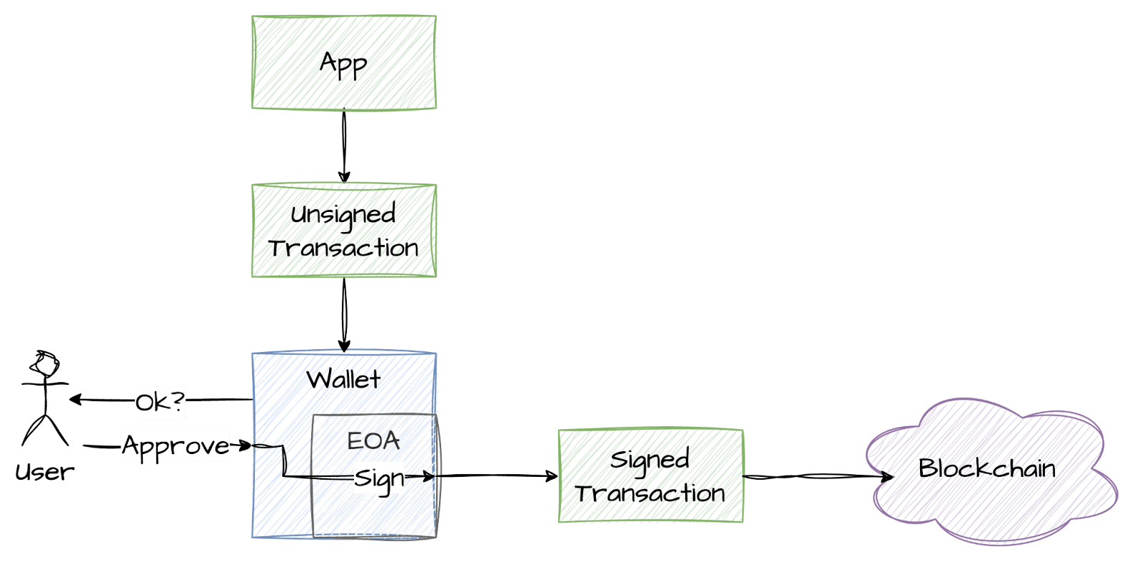 With an EOA wallet, like MetaMask, the user approves an unsigned transaction created by a blockchain app, typically by clicking some equivalent of "confirm" in the wallet’s user interface. The EOA private key inside of the wallet then signs the transaction, and the wallet submits the signed transaction to the blockchain. The EOA pays all of the gas fees, can execute at most a single transaction, the user has to "be in the loop" to approve the transaction, and care must be taken with the EOA’s private key (usually a seed phrase).