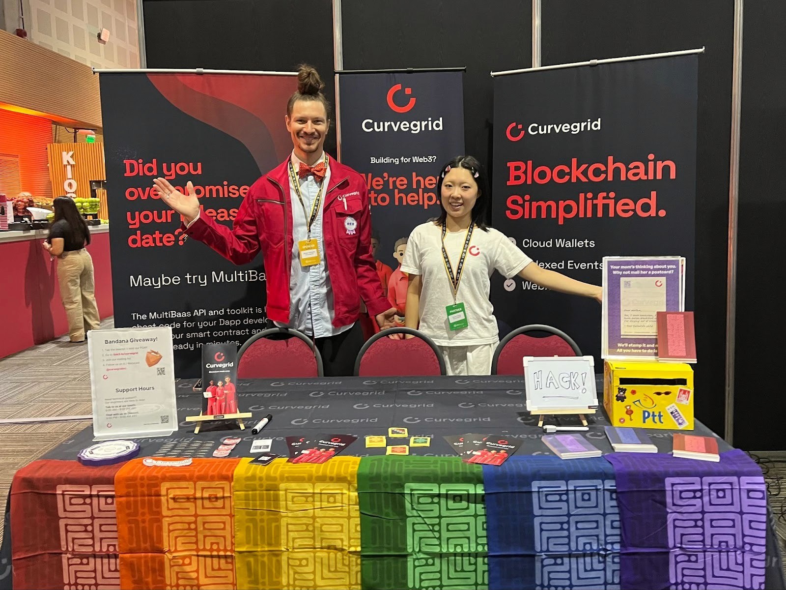 Curvegrid sponsored $5,000 to five teams that demonstrated the best use of MultiBaas, our blockchain development platform. Hackathon attendees who visited our booth even got to take home stickers, POAPs, and colourful bandanas. We mailed out postcards for people who stopped by and wrote something for their loved ones back home.