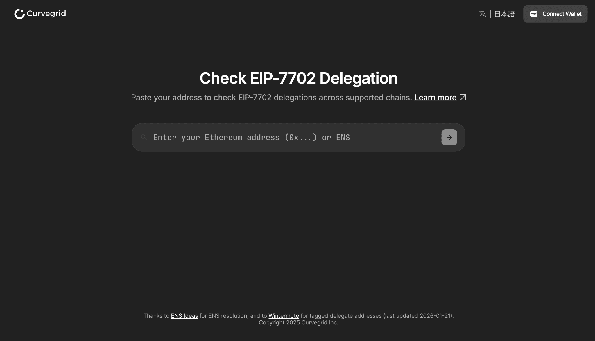 Users paste an address or ENS name, click a button, and immediately see their wallet’s EIP-7702 delegation status across supported EVM chains.